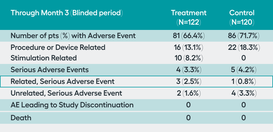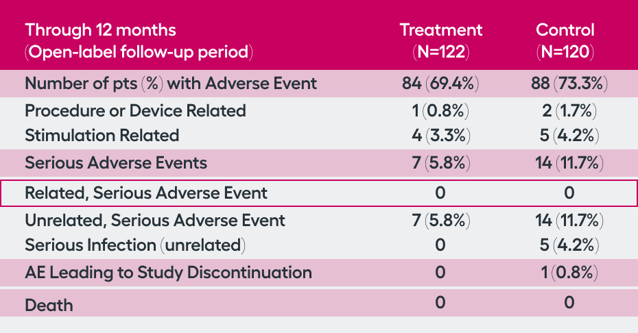 SetPoint System, and its placement procedure, were considered safe. There was a low rate (1.7%, n=4) of related serious adverse events in the peri-operative 3 months, with no (0%) related serious adverse events occurring through 12 months. Additionally, through 12 months, there were no malignancies, cardiac issues, or serious infections considered to be related to the SetPoint System, highlighting the safety of this novel therapeutic option.